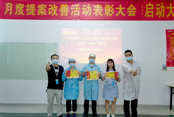 2月份,共收到員工提出141項提案,經各評審小組審核評選,最終角逐出一等獎1名,二等獎3名,三等獎6名,評審小組成員分別為優秀提案改善項目人員頒發榮譽證書、獎金,并合影留念。