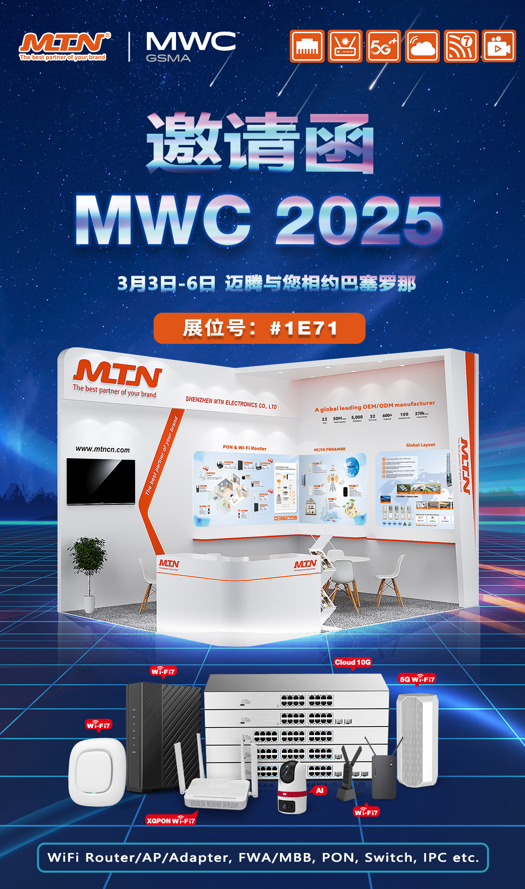 2025年世界移動通信大會(25MWC)盛大啟幕在即,這是一場全球矚目的通信行業(yè)盛會,邁騰電子攜Wi-Fi 7 Router、4G/5G FWA&MBB、AI-IPC等一系列產品和技術亮相。在此,我們誠摯地邀請您蒞臨我們的展位,一同探索通信科技的無限可能!