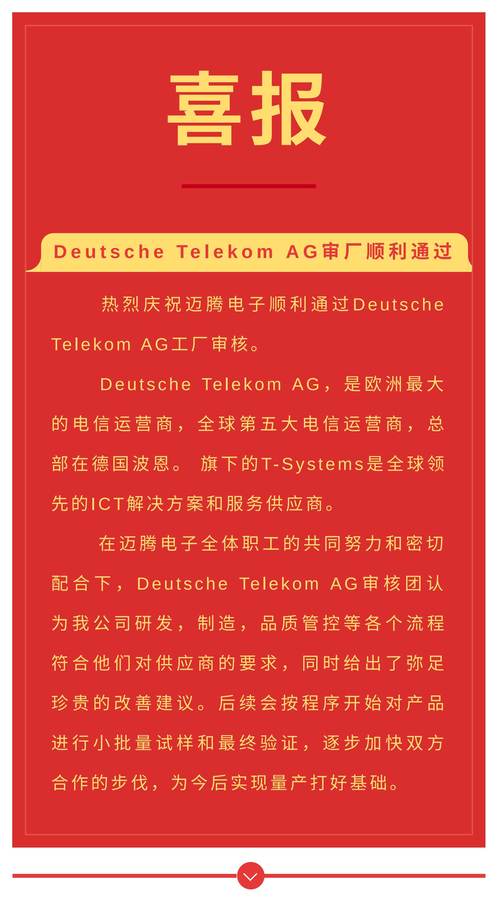 喜報|熱烈慶賀邁騰電子通過Deutsche Telekom AG審廠!