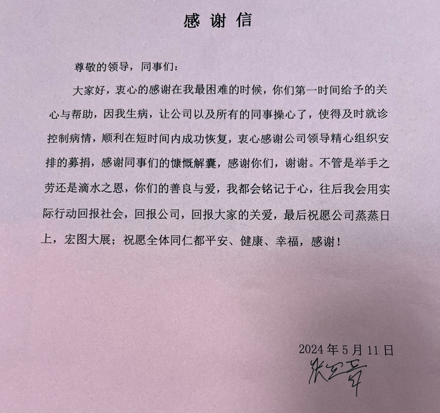 張四晉在收到愛心捐款后,寫下一封感謝信。寫道:“謝謝各位領導和同事在我最困難的送來關心,向大家表示衷心的感謝,滴水之恩當銘記于心。”